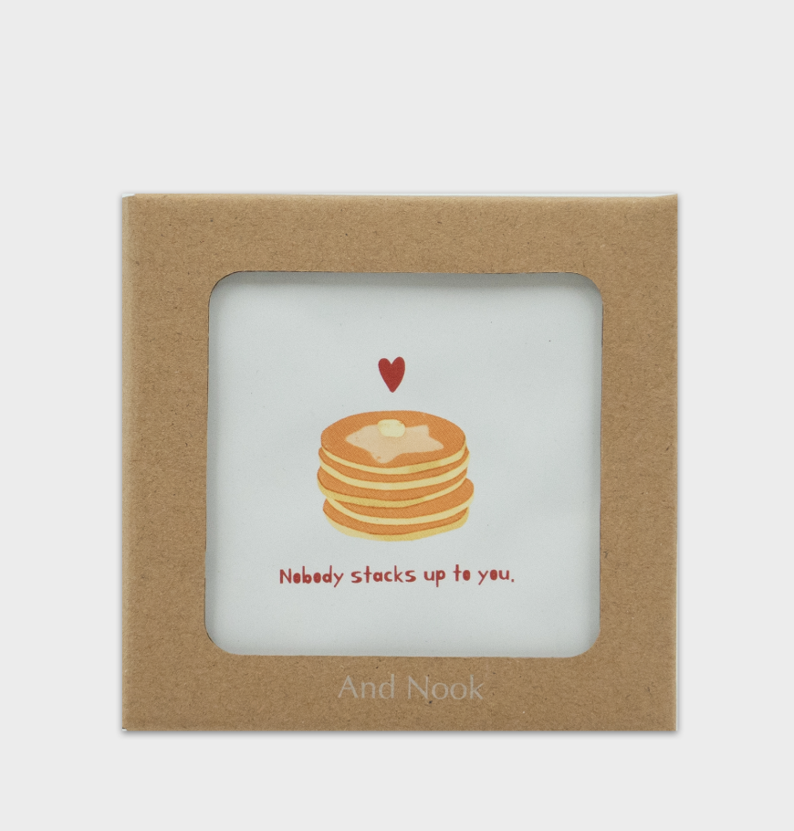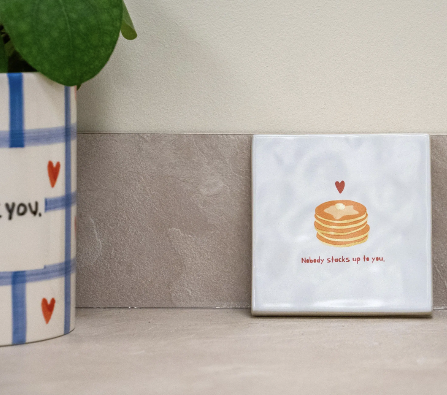 Cette adorable tuile en céramique est ornée d'un dessin de pancakes et du message « Personne ne t'arrive à la cheville ».
