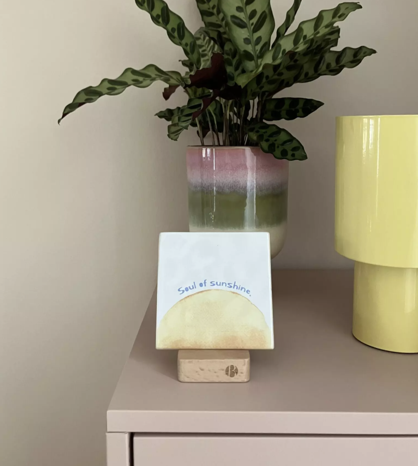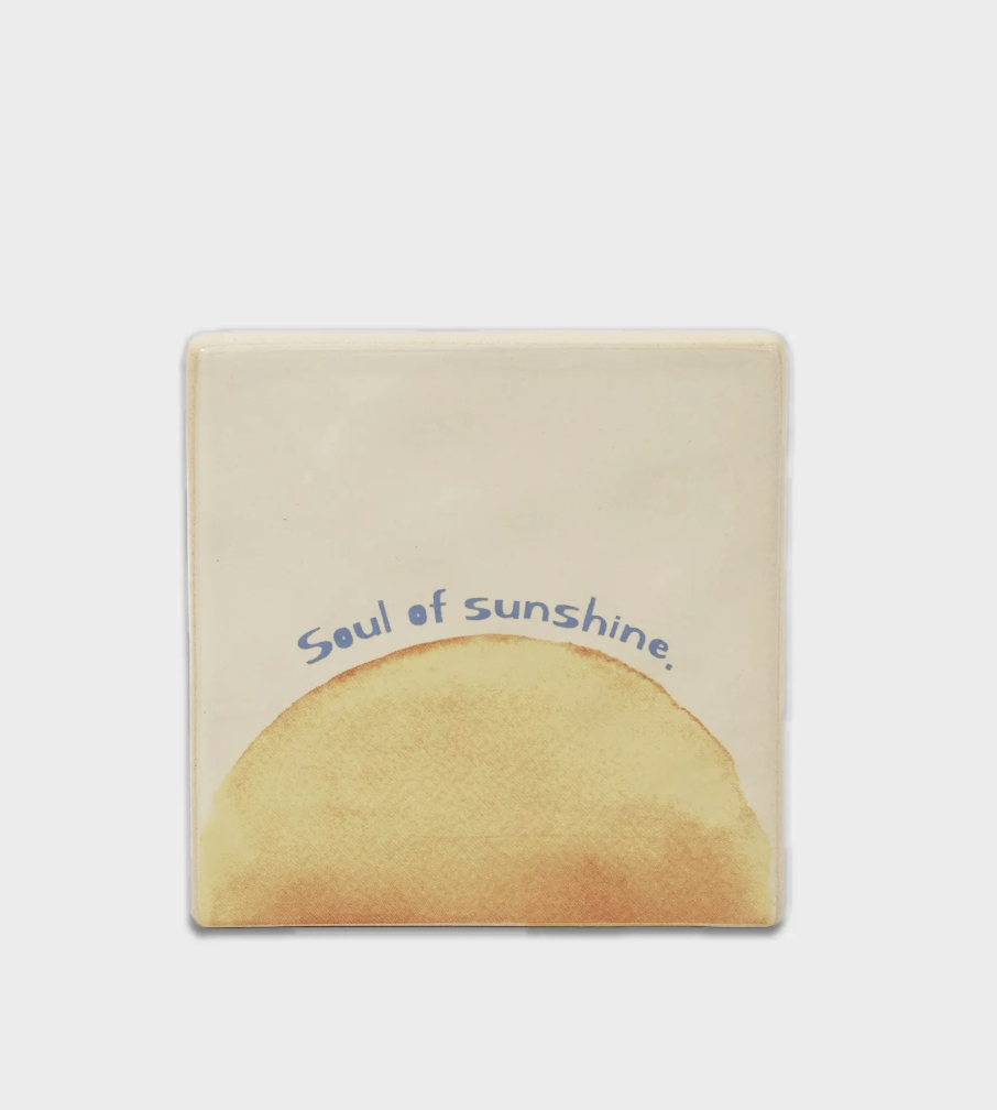 Ce ravissant carreau de céramique blanc est orné d'un dessin de coucher de soleil. On y trouve également l'inscription « âme de soleil ».