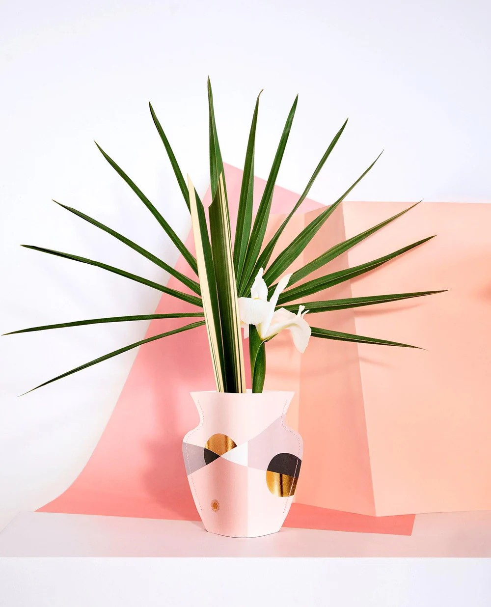 2. Ouvrez le vase en papier en appuyant délicatement sur les bords et glissez-le sur le récipient. Le vase est en papier imperméable. S'il est mouillé, laissez-le simplement sécher. Disposez les fleurs et embellissez votre endroit préféré.